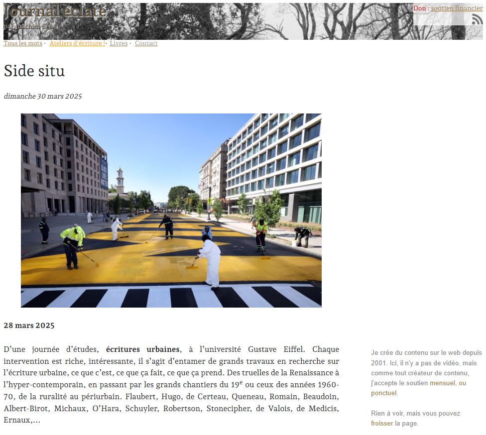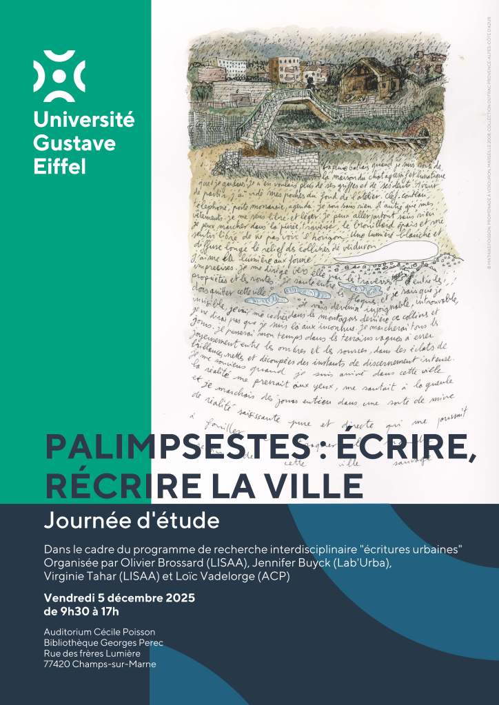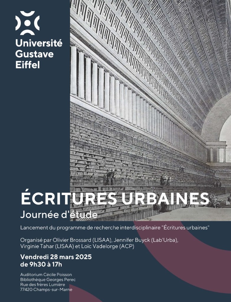 Le prochain séminaire du projet de recherche interdisciplinaire « écritures urbaines » aura lieu le vendredi 23 janvier 2026 après-midi (de 14h à 17h) à la Ferme du Buisson (à Noisiel), dans la salle « la piscine ». Comment aller à la piscine ? Cliquer ici.